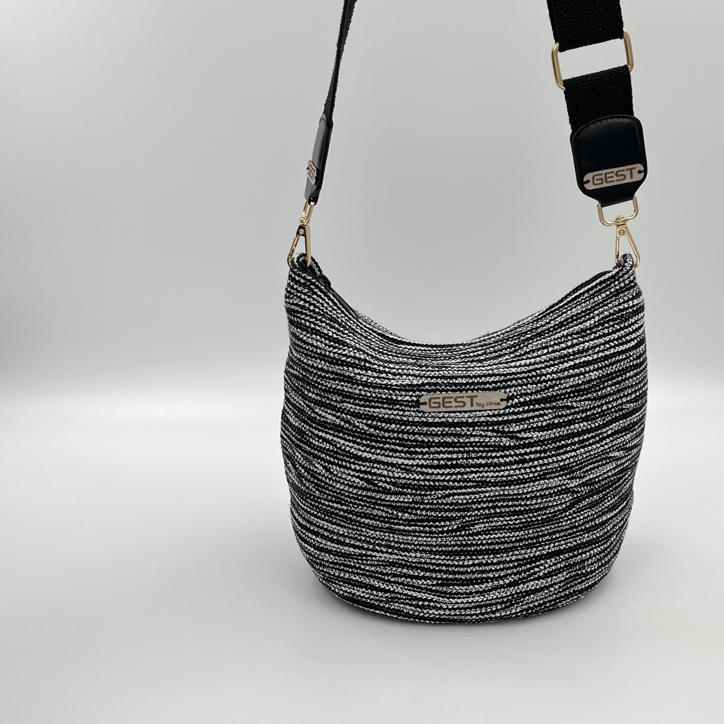 Torebka typu klasycznego, dość duża. Wykonana ze sznurka bawełnianego (5mm) z rdzeniem poliestrowym. W środku wykończona podszewką koloru czarnego w białe kropki, w której znajduje się kieszeń zapinana na zamek. Pasek czarny miękki. Torebka w całości ręcznie robiona, unikatowa dostępna w jednym egzemplarzu.