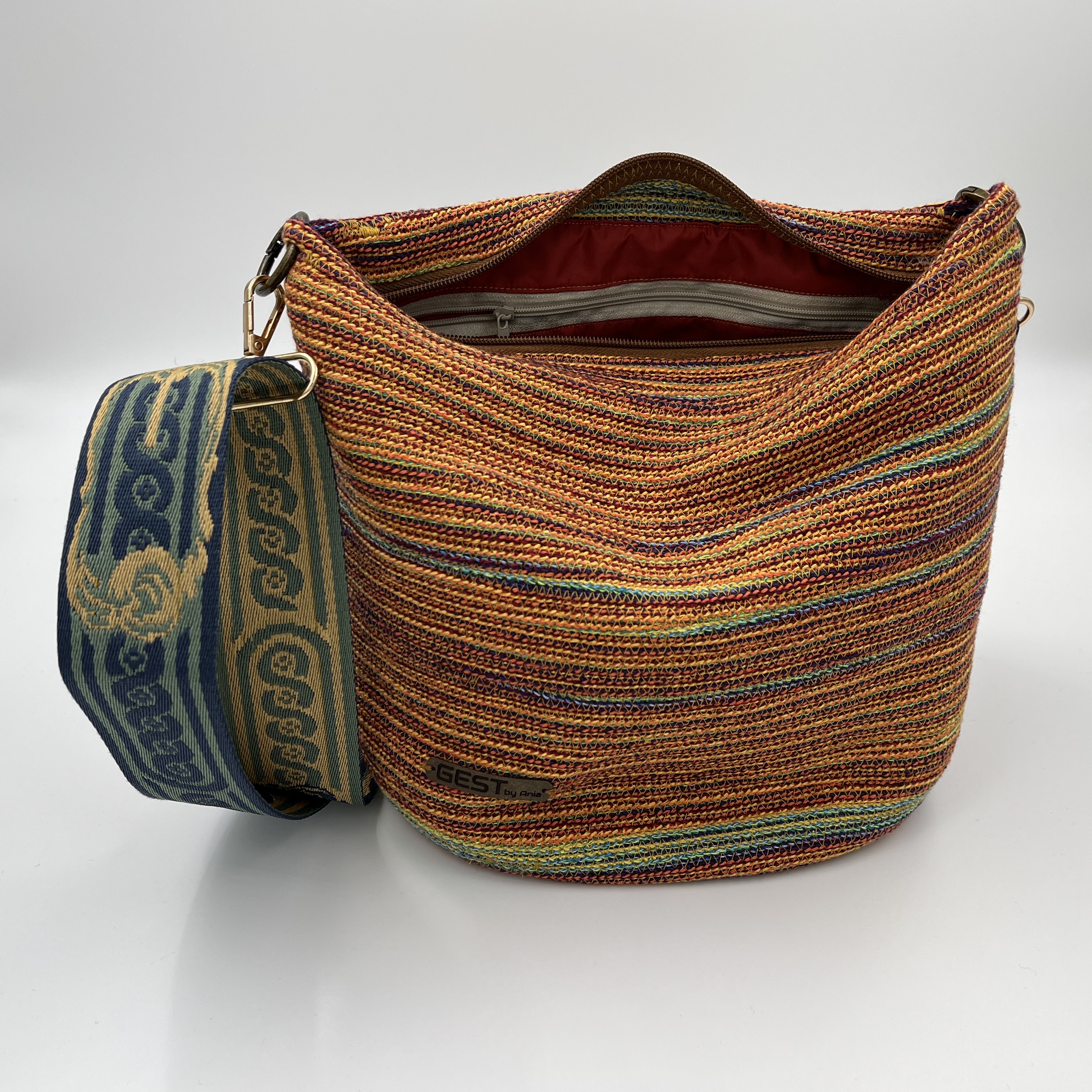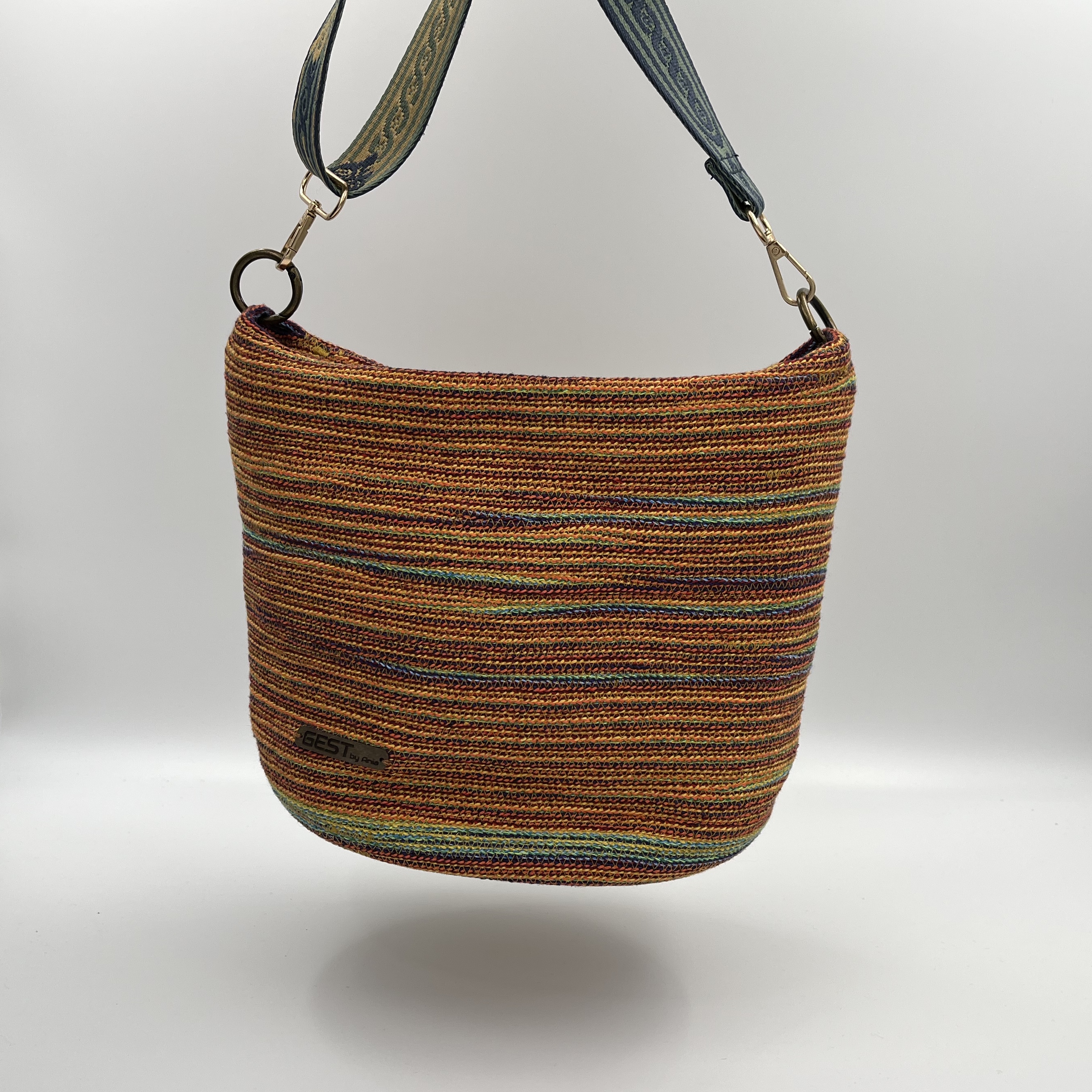 Torebka typu klasycznego, dość duża. Wykonana ze sznurka bawełnianego (5mm) z rdzeniem poliestrowym. W środku wykończona podszewką koloru rudego, w której znajduje się kieszeń zapinana na zamek. Pasek stonowany. Torebka w całości ręcznie robiona, unikatowa dostępna w jednym egzemplarzu.